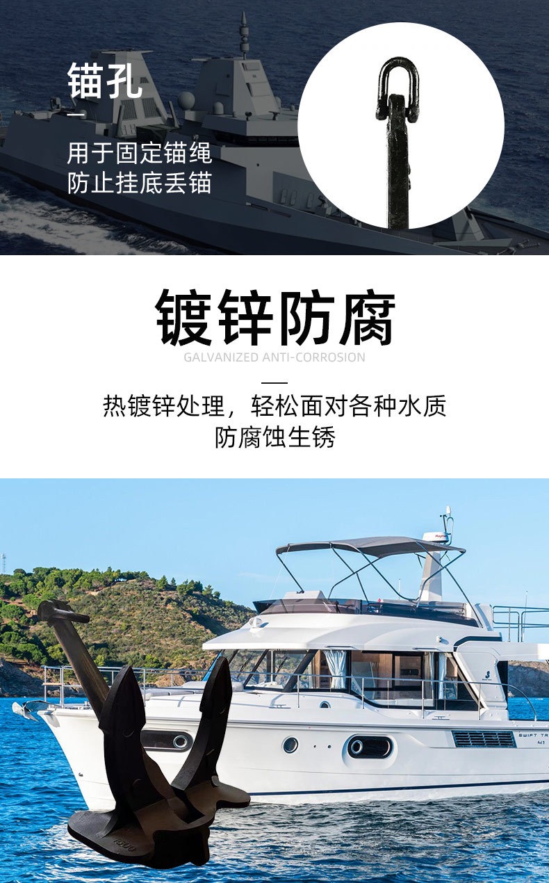 霍尔锚又称山字锚。是一种锚爪可自由转动与锚干成一定倾角的无杆锚。锚头与锚爪为一整体铸件。锚干穿过锚头,用一根锚干轴销和两根锚头横销锁住,使锚头、锚爪能以锚干轴销为轴作前、后各45°的转动。当锚平卧以锚爪的任何一面接触水底时,在锚链的拉动下,锚头突缘摩擦底土所产生的阻力迫使锚爪梨入底土产生抓力。其抓力约为锚重的2.5~4.0倍。这种锚的特点是结构比较复杂。但抛起方便,锚干能直接插入锚链筒,收藏方便稳当。为近代船舶广泛采用。