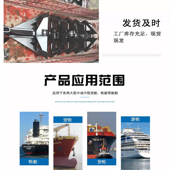 锚|船锚|铸造锚|钢铁锚|德尔塔锚|三角锚|海工锚|霍尔锚|斯贝克锚|AC-14大抓力锚|日式无杆锚|海军锚|波尔锚|马氏锚|丹福尔锚|有杆锚|斯蒂芬锚|MK5锚|MK6锚|沉石|沉块|系船柱|系缆桩|锚链管|锚唇|导缆孔|止链器|止链器托架|梨形锚